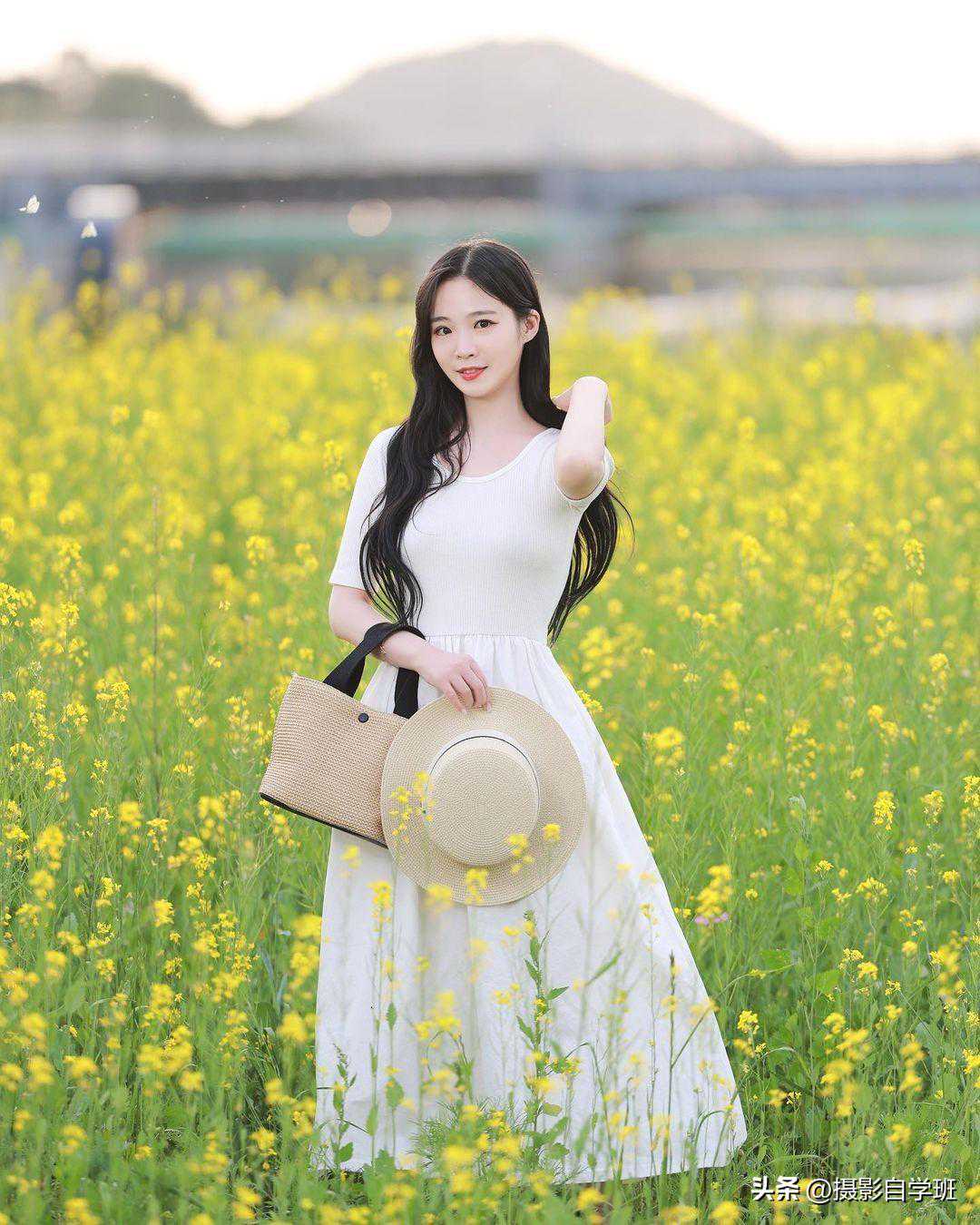 道具的使用可以为照片增添更多的趣味性和故事性。在拍摄油菜花人像时,可以准备一些道具,如背包、帽子等,让人物与道具互动,增加照片的生动感。例如,人物可以戴着帽子在花海中漫步,或者将背包放在身边作为支撑,这些都能为照片增添更多细节和层次感。还可以像图7这样,挎着包,正对着镜头。