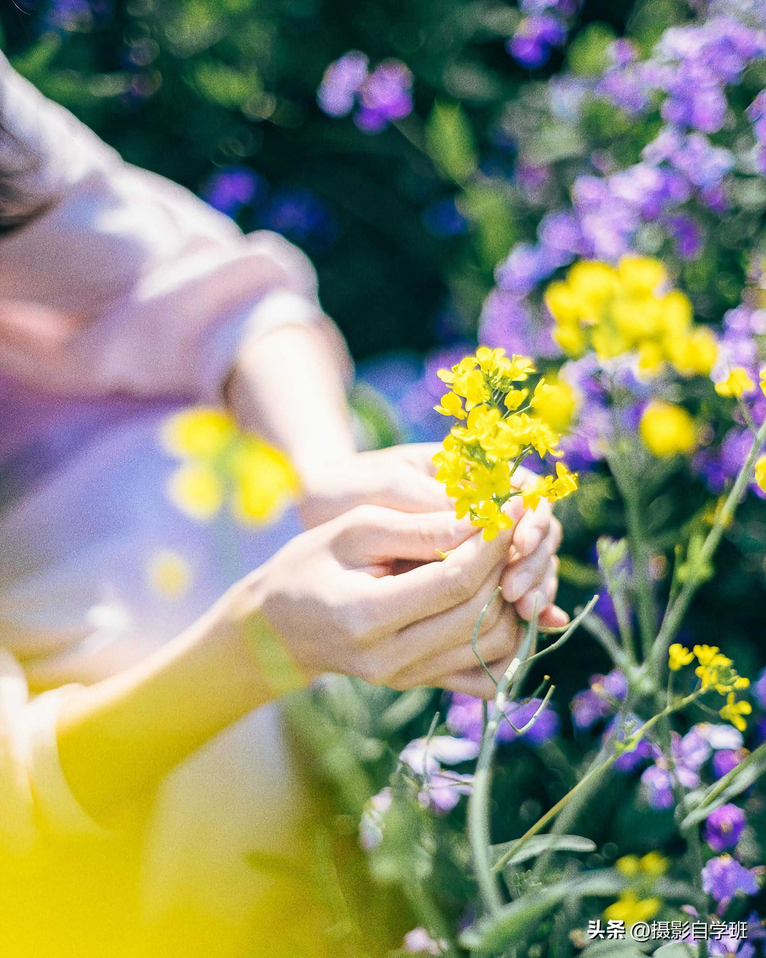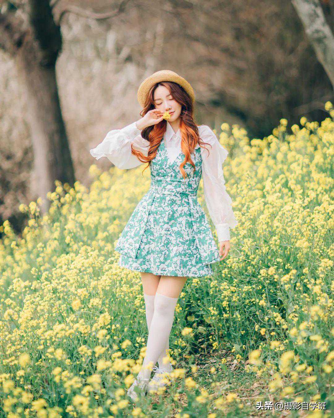 这个动作既浪漫又充满诗意,非常适合拍摄油菜花人像。让人物轻轻捏住一朵油菜花,然后放到嘴边,仿佛在品味春天的味道,像图10这样。这样的动作能够很好地展现人物的柔美和浪漫气质,同时也能与油菜花海的背景形成完美的呼应。