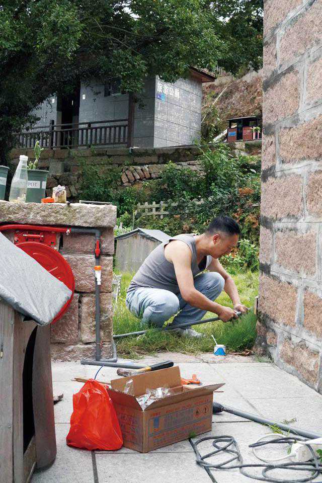 张叔正在手工做民宿的消防水管,他认为回乡做民宿是对家乡的一种情怀(南方人物周刊记者聂阳欣/图)