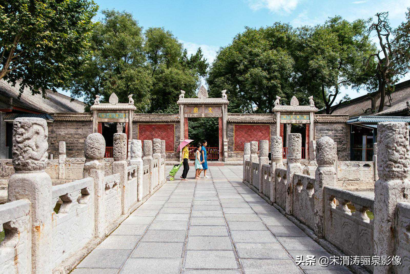在观看了蓝天白云下的牌坊后,我在泮池边细致拍摄了一会,以棂星门作为主体,以泮池及栏杆作为前景,拍摄了蓝天白云下的棂星门,且偶遇一队爷孙,为他们留下的美丽的旅游纪念照。