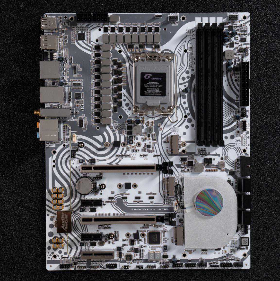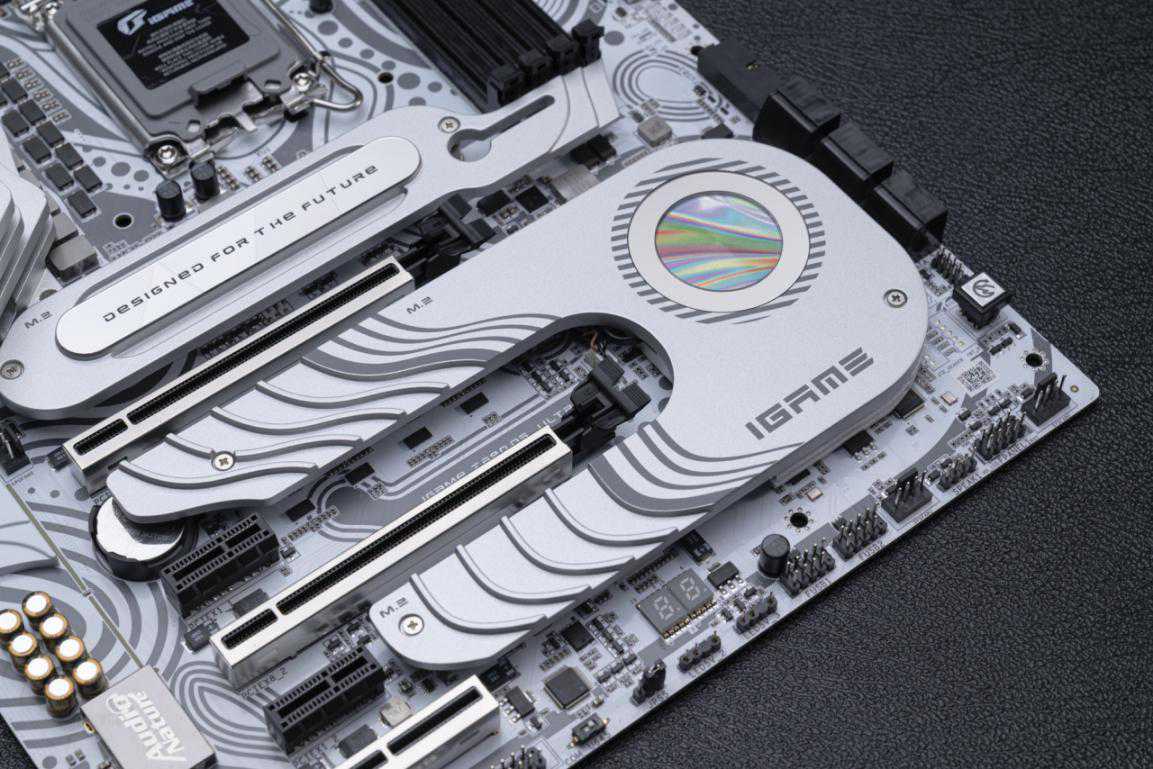 不仅仅是白色的PCB让人眼前一亮,iGameZ690D5Ultra的散热装甲也展现了科技与潮流艺术的结合,体现出“未来感”。该主板使用了新一代冰阶空间散热装甲,不仅有着较大的散热体积,还采用了仿生态的波浪设计,每层散热片错落有致,能够更好的提高空气接触面积,从而进一步提升散热能力。