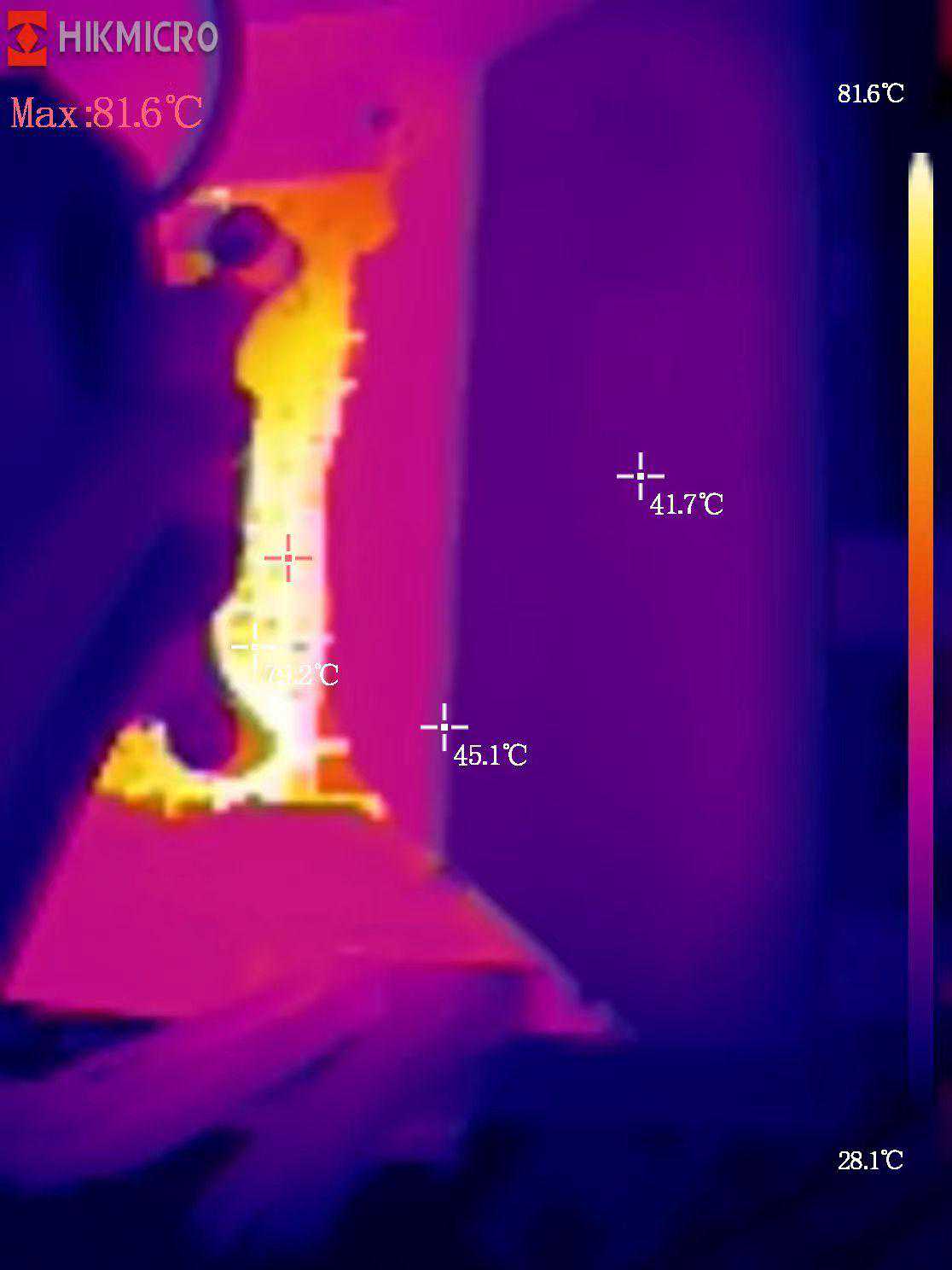 温度方面,在室温29℃的办公室环境,我们使用CineBenchR23多核心测试连续考机30分钟,然后使用海康威视P10B热像仪查看温度,可以看到,主板的VRM供电区的温度表现比较不错,最高温度仅为81.6℃,即使在即将到来的夏季,玩家也无需担心温度问题。