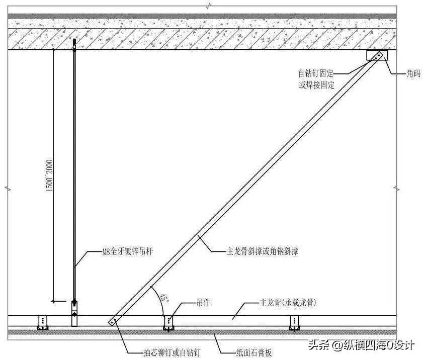 °斜支撑2m一根,从中心呈梅花形散开支撑主龙骨,不同直线、不同方向”八“字形错开分布。