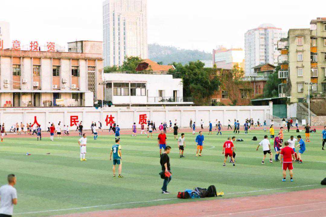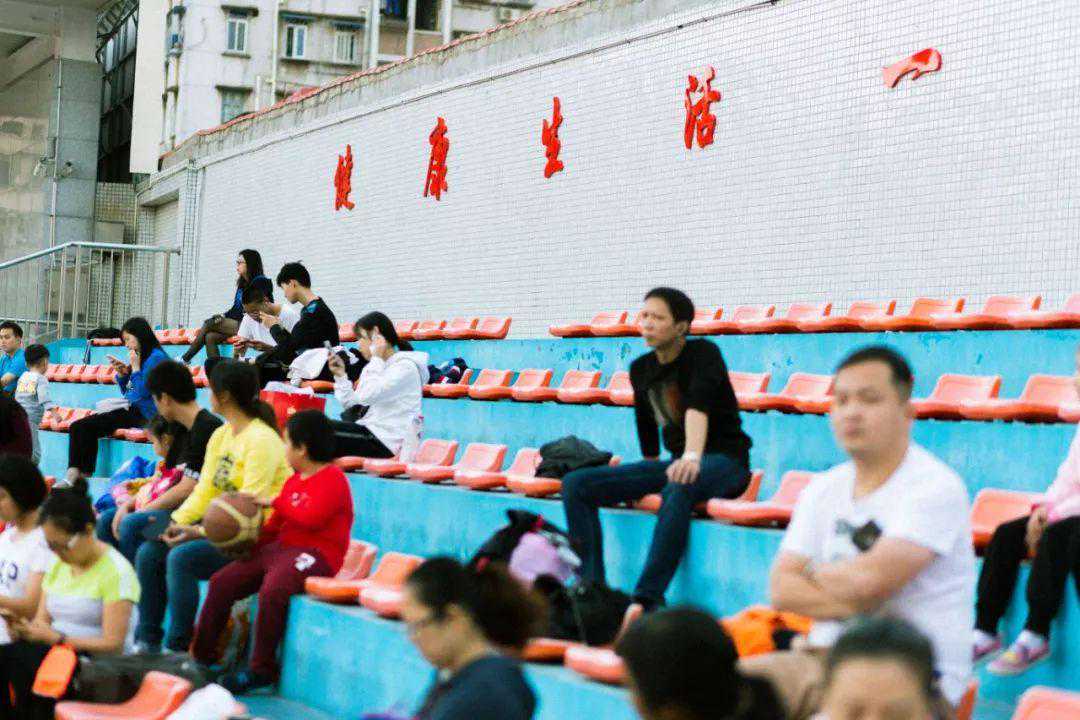 位于厦禾路和幸福路交界,开放的公用体育场,黄昏时分光线充分,红座椅蓝看台对比鲜明。