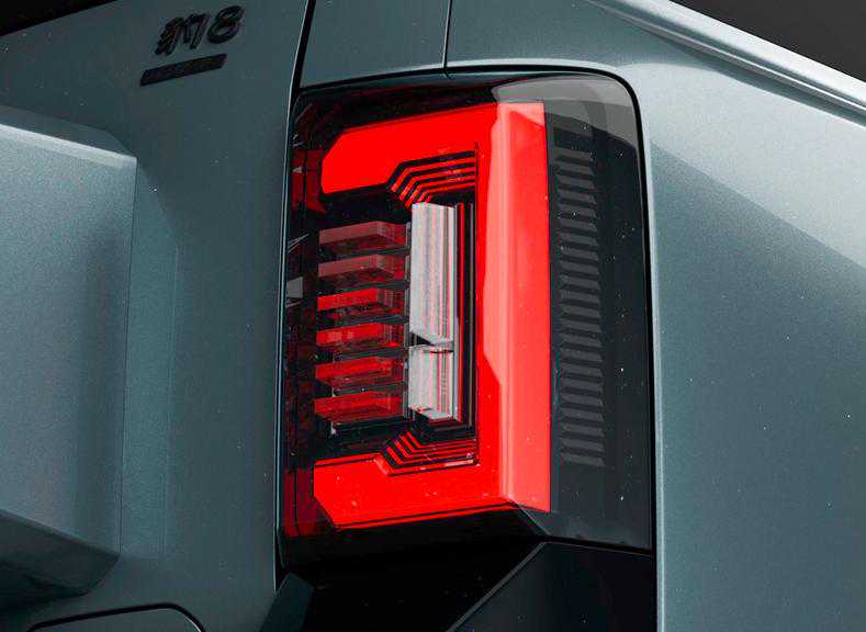 尾部采用外挂式备胎,并搭载行星环备胎罩,硬派十足。采用能量推进尾灯设计,点亮后辨识度较高。底部还采用外凸的后保险杠造型,由黑色装饰板与银色装饰板组成,符合车型本身的定位。