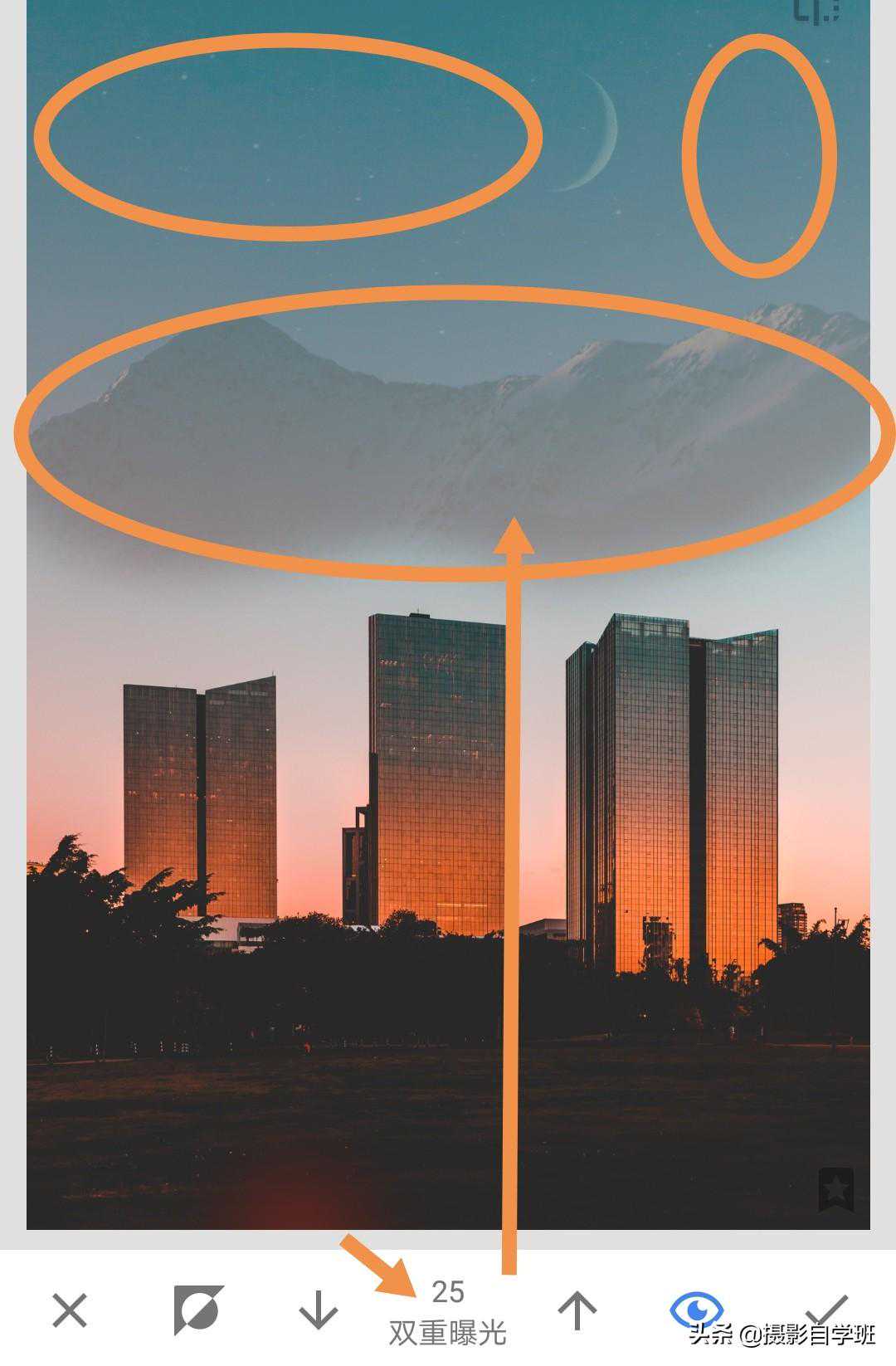(6)用手机修图软件Snapseed打开建筑照片。工具,双重曝光,添加图片。把准备好的月亮素材,添加进来,移动到建筑上方。