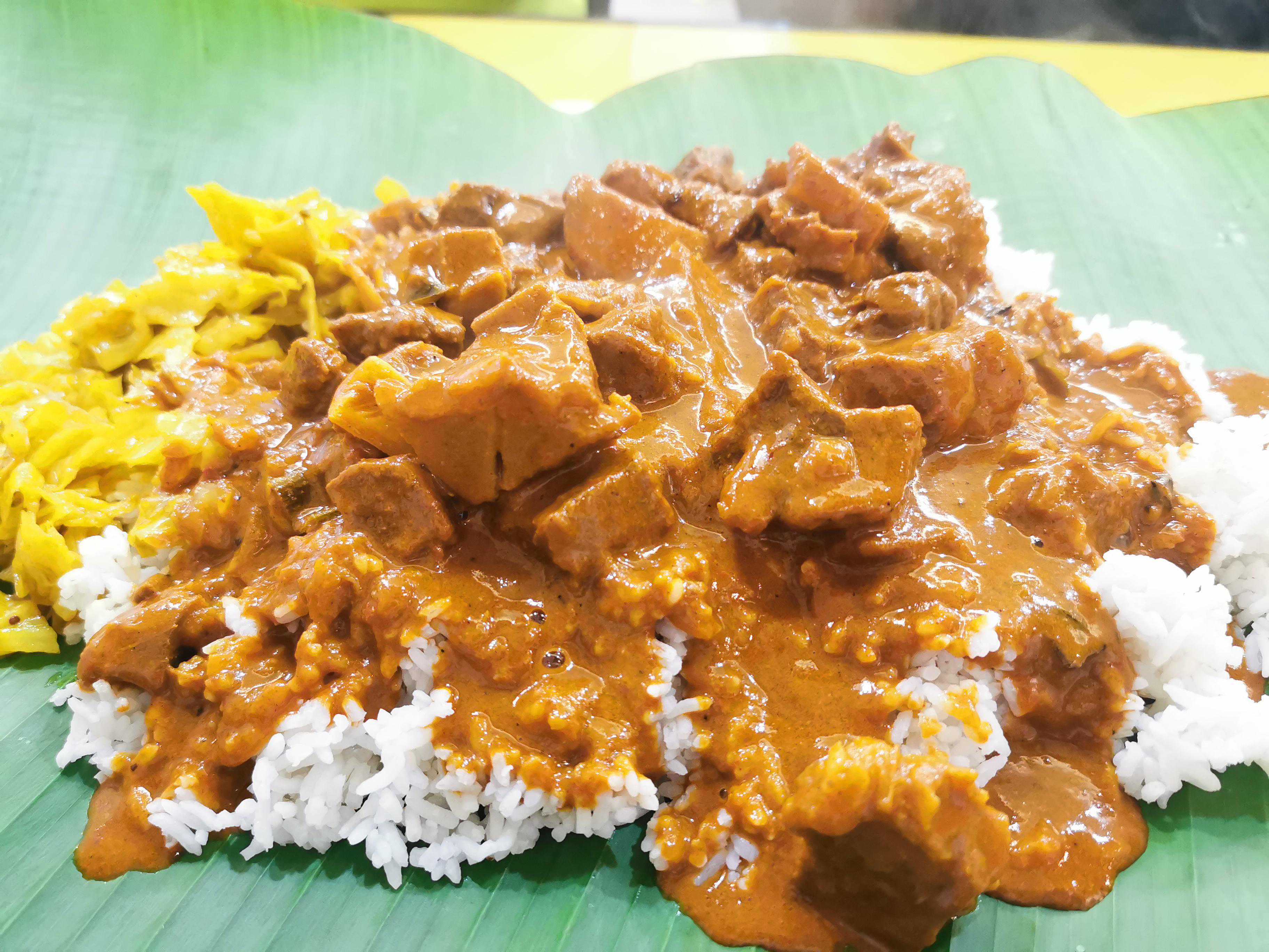于是老大找一天带我去进品尝,原来这里主打是咖喱羊肉。他们煮的咖喱羊肉分两种:一种是用砂锅把米饭、咖喱汁、羊肉一锅煮熟,类似广东煲仔饭;再有一种就是把米饭铺放在香蕉叶上,然后淋上热腾腾的咖喱汁和羊肉。两种都非常好吃,但由于方法不同会使米的口感及与汁的混合程度不同,稍有一些差异。