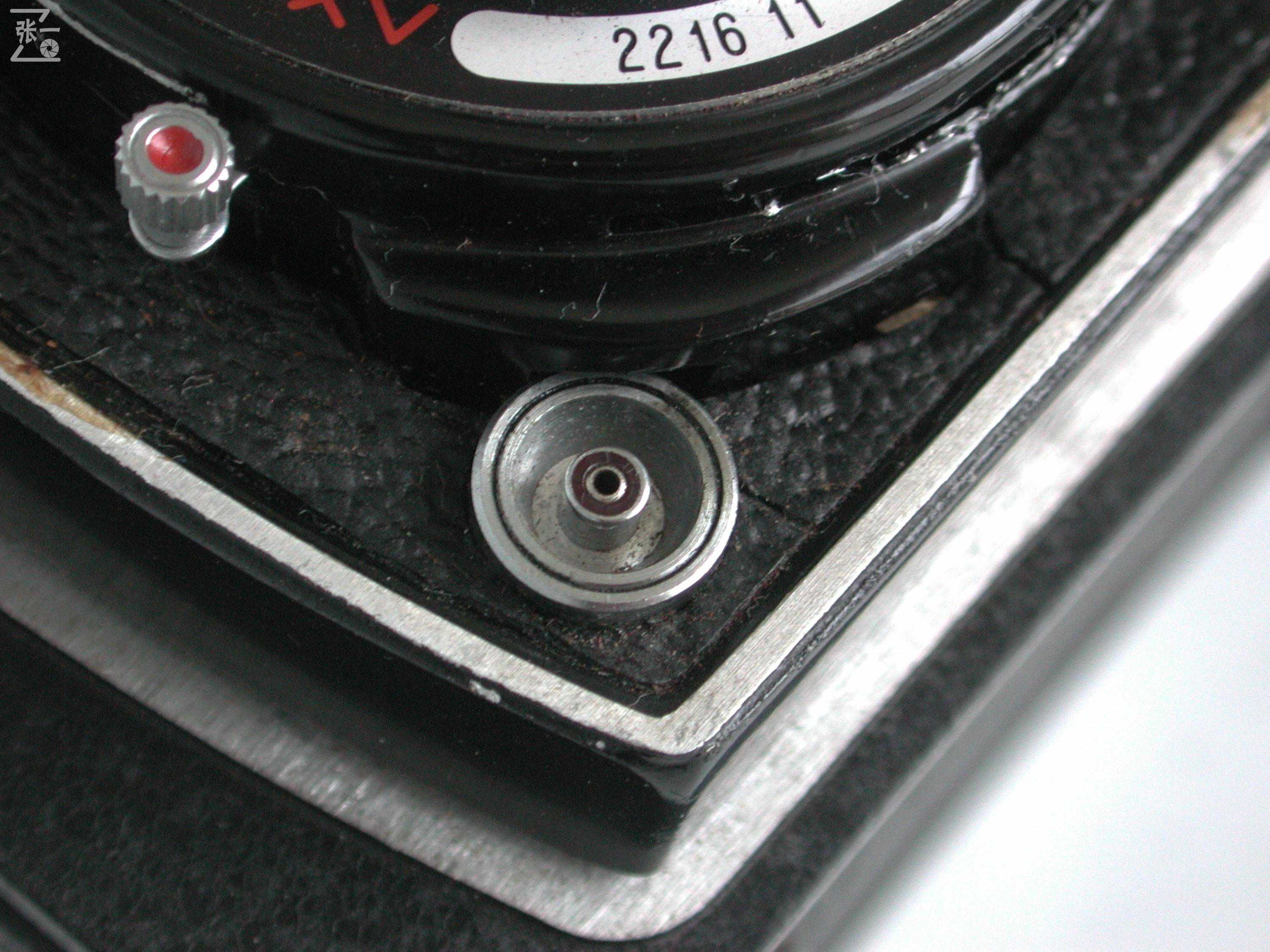 这款WalzflexIIIA的取景器设计也很有特点:除了用于精确对焦的可折叠放大镜外,该机在对焦屏上特意设计了一个圆形凸起,其作用类似于一个放大倍率率不是很大的放大镜。这样在某些情况下,无需使用折叠起来的放大镜,就可以实现相对精确的对焦了。